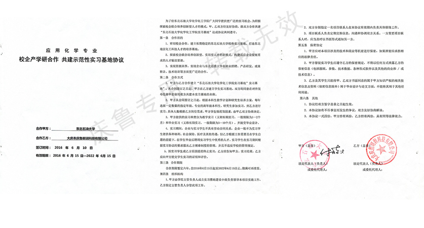 為積極探索校企聯(lián)合培養(yǎng)創(chuàng)新型人才的模式同時為在校大學生提供廣泛的實習機會,大慶慶魯朗潤科技有限公司與東北石油大學合作共建“東北石油大學化學化工學院實習基地”。該基地的建立加強了高校與企業(yè)的合作實現(xiàn)資源共享,探索校企聯(lián)合培養(yǎng)創(chuàng)新型、實用型人才的新模式,構建適應企業(yè)發(fā)展需求的人才輸送渠道,努力打造東北地區(qū)化工科技人才的培養(yǎng)基地。
